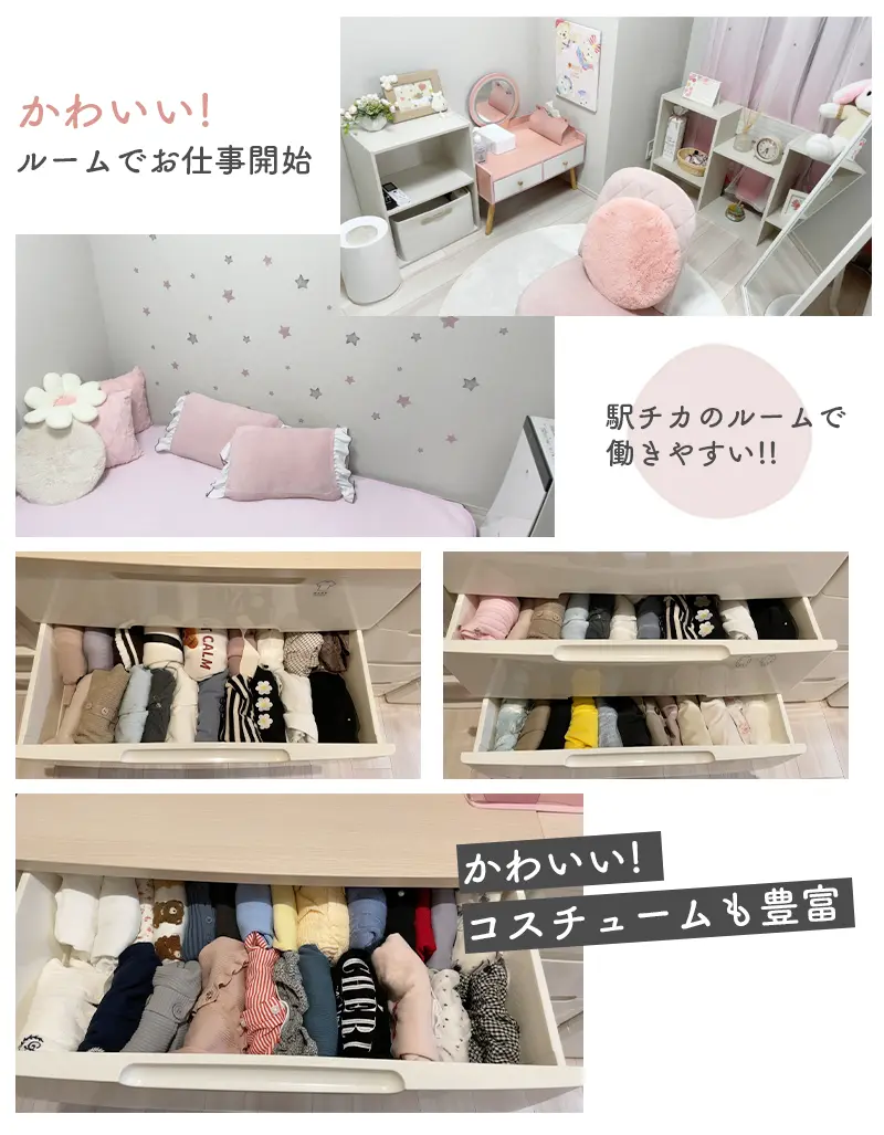 経験豊富なスタッフが稼ぐためのノウハウを一からお教え致しますので誰でも高収入を得られる体制でサポート致します。また仕事以外のお悩み・ご相談などもお気軽にご相談下さい、安心してお仕事に打ち込んでいただけるよう全力でサポートさせていただきます。